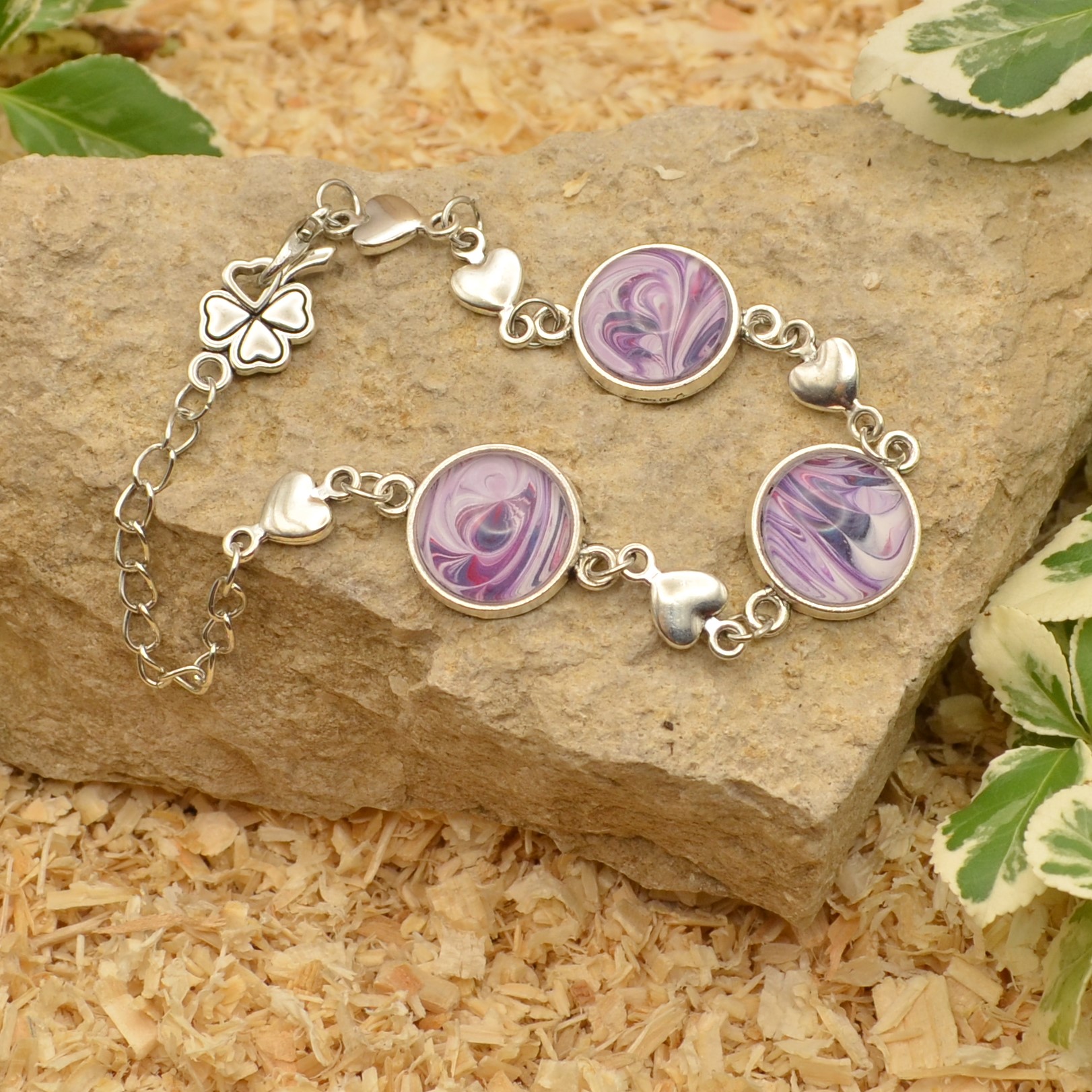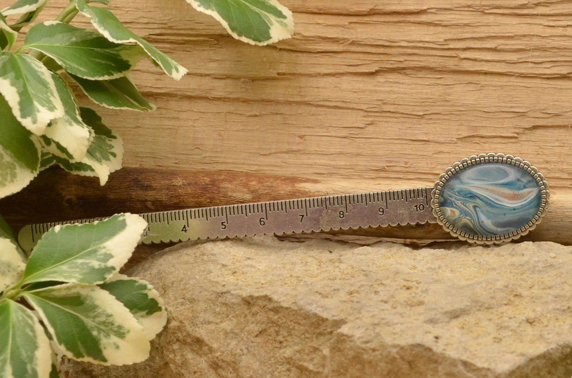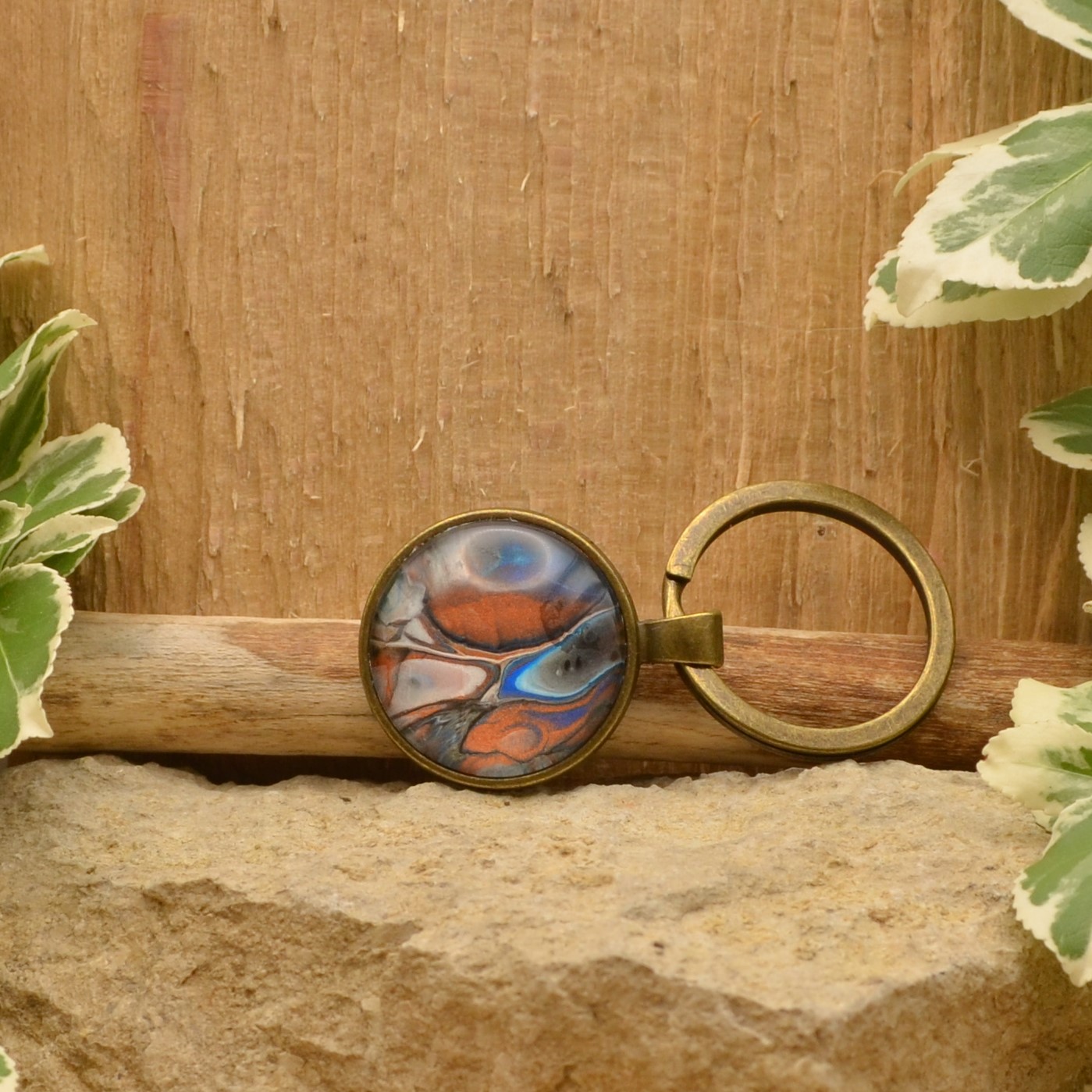 Ich arbeite mit hochwertigen Künstleracrylfarben. Der Beginn einer Arbeit ist immer das Malen eines Bildes auf Leinwand/Keilrahmen. Die Farben werden einzeln angerührt, gemischt, für den Malprozess vorbereitet. Das kann durchaus schon mal eine Stunde lang dauern. Da ich am Anfang natürlich nie genau weiss, wieviel Farbe ich für das Bild anrühren muss, bleiben immer Reste übrig. Diese Reste sind zu wertvoll als dass man sie einfach entsorgen könnte. Also überlegte ich mir, was ich Sinnvolles und Ästhetisches damit machen könnte und so kam ich auf die Idee, sie für Schmuck zu verwenden. Ich male aus ihnen die Inlays für meine Halsketten, Armbänder, Ringe, Ohrringe, Haarschmuck, Schlüsselanhänger und Lesezeichen - alles Unikate, einzigartig wie wir selbst.